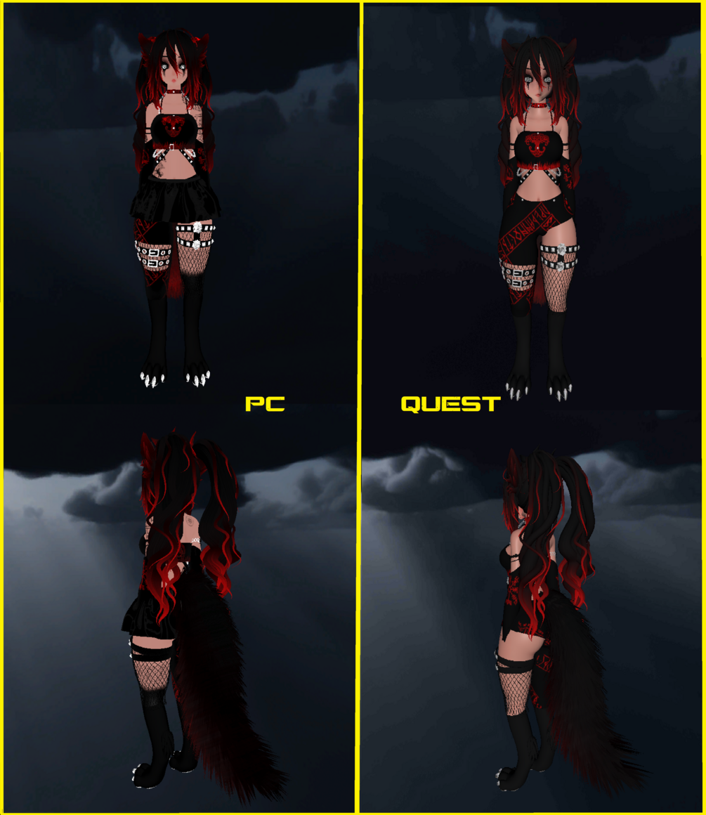 -Quest do not have, the basic as Throwjoint, hues shift, Animations with light and sound, Demon Tail and it have one 1 set of eyes, and skirt-