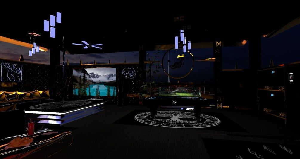 #1You start off spawning in main room with its own color theme of gold/Silver/baby blue. You are going to find a toggle wall to control AudioLink, rain, thunder, pickups, chairs, dance pole, light, bodypillow, pool , chess, video player, pens ,dust particles, There is also a small wall to place your avatar on the standers if you like to.