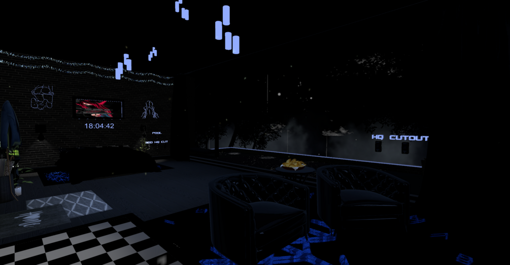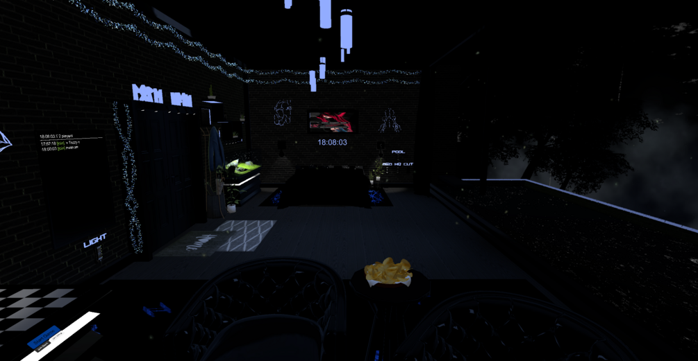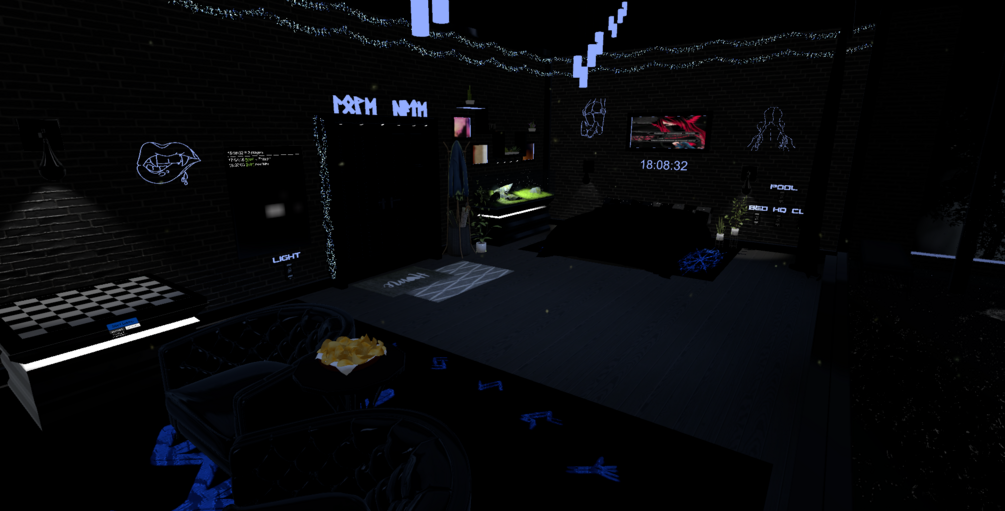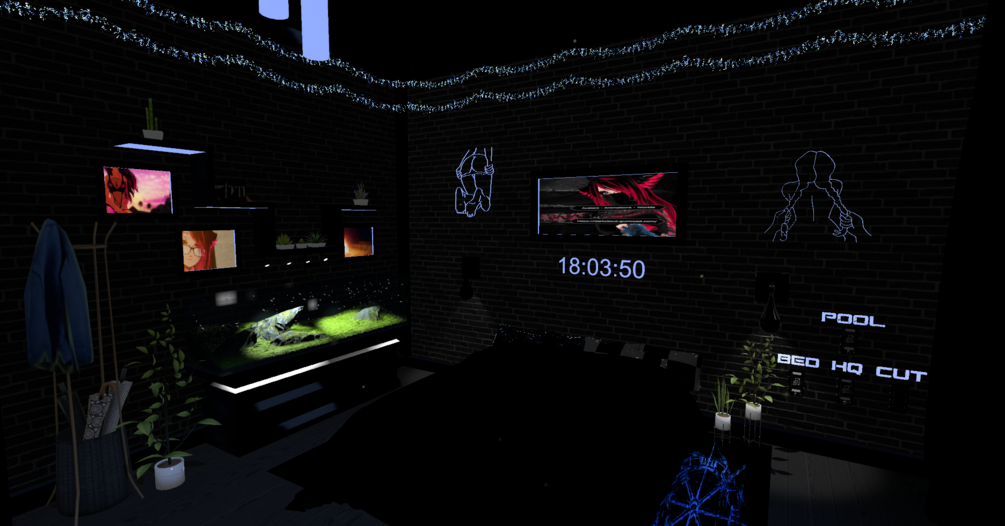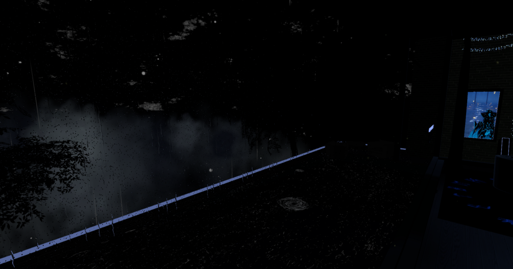 The world is a small room covered in the darkness of the night, with moving clouds, rain and Dim light and more. You are going to find a few games, video player. Pictures from my discord people have been posting and thats about it. I hope you like it