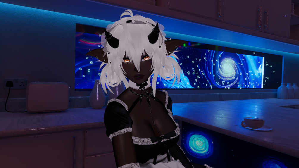 Avatar Toggles: Feather duster with smoke effect on colliders. Mop with smoke effect on colliders, Tits size, Tattoo hue, Skin color, Makeup, Makeup hue, 2 Hair style with 4 hair colors, Black & Black with color, White & White with color. Both Hair with color have hue. Black eyes, Eyes with color, Eye Hue, Paddle, Flogger, Crop, Handtrails, Demon tail, Jewellery for the tail, Horns, Elf ears, Necklace, Nipple piercings, Face piercings, Rings, Glasses, Choker, Hair pins, Dress, Head dress, Gloves, Socks, Shoes, Leg gather, Harness, Panties. Menu + toys GoGo Loco